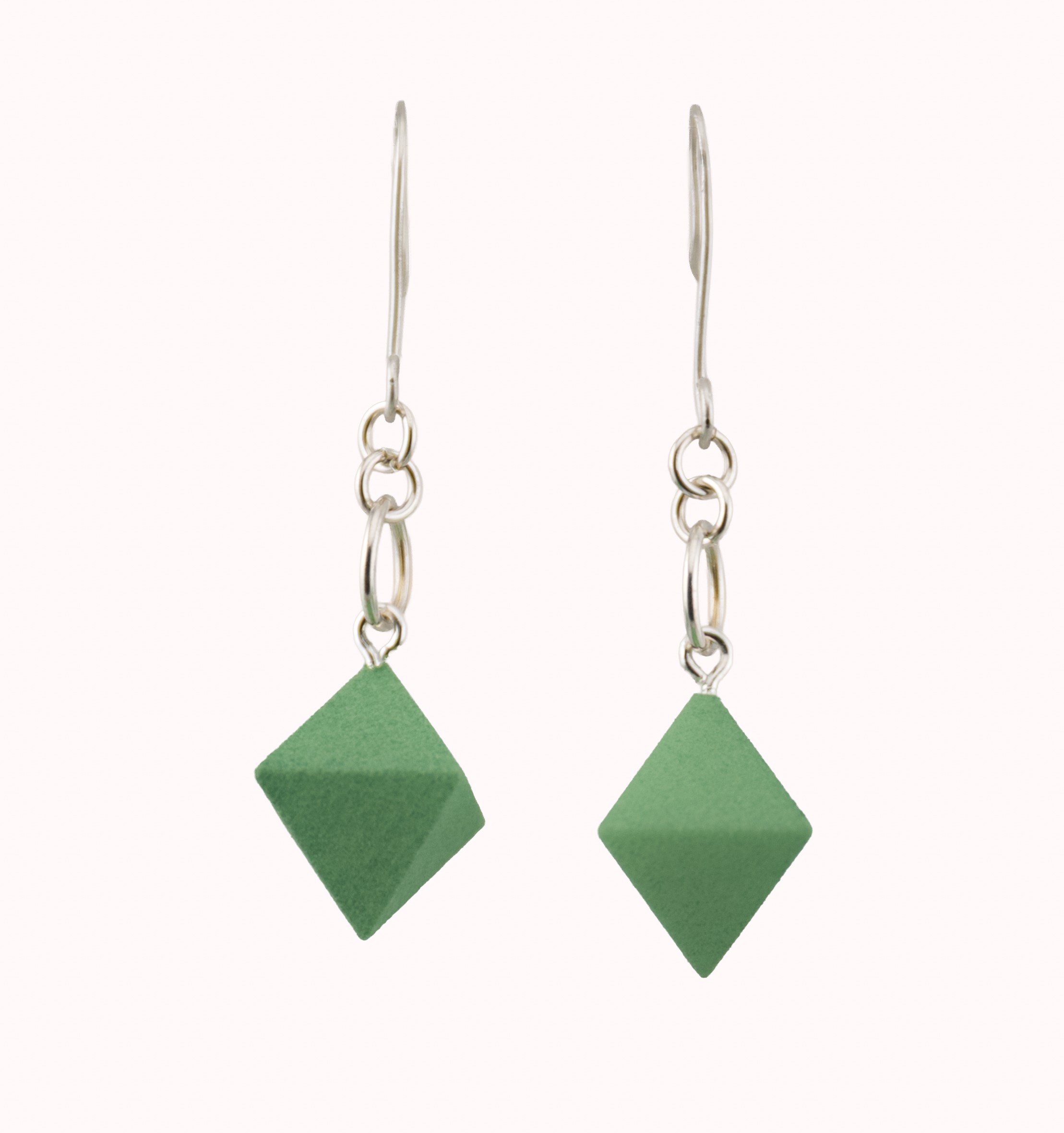 Each octahedron is carefully 3D printed for crisp structure and lightweight comfort, then hand-dyed in layered shades of fluorite green. Suspended from handmade sterling silver ear wires, these earrings are designed for effortless, all-day wear. Light, vibrant, and full of character, they bring a playful yet refined edge to any look.